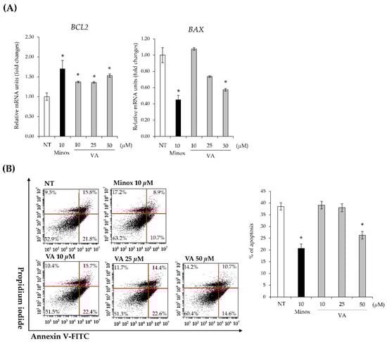 During the catagen phase, apoptosis of HFDPCs is accelerated, contributing to hair loss []. Minoxidil has been reported to exert anti-hair loss effects by inhibiting HFDPC apoptosis [,]. To determine whether VA reduces HFDPC apoptosis, we examined the expression levels of BCL2, an anti-apoptotic factor, and BAX, a pro-apoptotic factor. As shown in Figure 4A, VA upregulated BCL2 expression while downregulating BAX expression. BCL2 is an anti-apoptotic protein that inhibits mitochondrial outer membrane permeabilization (MOMP), preventing cytochrome c release and caspase activation, thereby blocking apoptosis. In contrast, BAX is a pro-apoptotic protein that promotes MOMP, leading to cytochrome c release and caspase-mediated apoptosis. The modulation of these key apoptotic regulators suggests that VA inhibits apoptosis by shifting the balance towards cell survival []. In addition, the proportion of apoptotic cells was assessed using a FACS analysis with PI and Annexin V staining. The results demonstrated that treatment with 50 μM VA reduced the proportion of apoptotic cells by 30% compared to the control group, which was set to 100% (Figure 4B). This result indicates that VA-mediated regulation of BCL2 and BAX contributes to the suppression of apoptosis in HFDPCs.