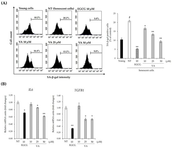 Veratric acid reduces senescence in replicative senescent HFDPCs. (A) Flow cytometry analysis of β-gal activity in replicative senescent HFDPCs cultured with VA or EGCG. #, p-value < 0.01 vs. the young group; *, p-value < 0.01; **, p-value < 0.01 vs. the replicative senescence-induced untreated group (control group). (B) Expression levels of IL6 and TGFB1 mRNAs in replicative senescent HFDPCs. *, p-value < 0.05; **, p-value < 0.01. All values were measured in triplicate (n = 3). Data are presented as mean ± SD.