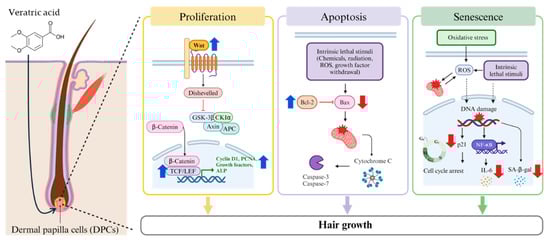 The activation of hair follicle dermal papilla cells (HFDPCs), a critical target of hair loss relief, can be achieved through the upregulation of proliferation, the stimulation of hair inducibility, and the inhibition of cellular senescence. Veratric acid (VA) is a major benzoic acid found in fruits and vegetables. The biological activity of VA on HFDPCs remains to be elucidated. In this study, we investigated the capacity of VA for hair loss mitigation. An MTT assay, Ki67 staining, quantitative RT-PCR (qRT-PCR), and a Western blot analysis were performed to confirm the proliferative effect of VA. Hair inductivity was determined through a cell aggregation assay and ALP staining. Annexin V/PI staining was performed to confirm the anti-apoptotic effect of VA. The inhibitory effect of VA on cellular senescence was confirmed by a β-galactosidase (β-gal) assay and qRT-PCR using replicative senescence and oxidative stress-induced senescence models. As a result, VA dose-dependently upregulated the proliferation of HFDPCs, the expression of growth factors, and β-catenin protein levels. VA also dose-dependently increased ALP activity and cell aggregation and decreased apoptotic cells through the regulation of BCL2 and BAX expression. Moreover, VA reduced β-gal activity and the senescence-associated secretory phenotype (SASP) in a dose-dependent manner in senescent HFDPCs. These findings suggest that VA may serve as a potential therapeutic agent for alleviating hair loss by targeting multiple pathways involved in HFDPC activation.