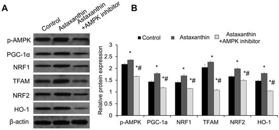 Effects of astaxanthin on expression of AMPK pathway proteins, mitochondrial biogenesis proteins, and antioxidant proteins. (A) Western blot analysis of expression of AMPK pathway proteins (p-AMPK and PGC-1α), mitochondrial biogenesis proteins (NRF1 and TFAM), and antioxidant proteins (NRF2 and HO-1) in follicles on day 10. (B) Analysis of relative expression levels of these proteins using Image J image analysis software. Experiment was repeated three times independently (N = 3), and 40 follicles were used in each group. * p < 0.05, compared with control group. # p < 0.05, compared with astaxanthin group.
