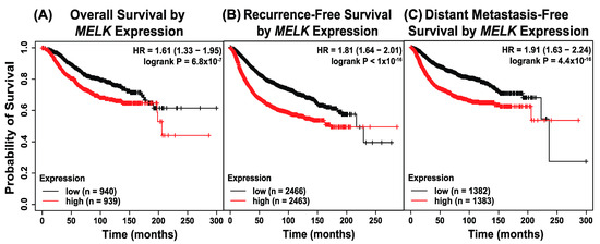 Kaplan–Meier survival analyses were conducted on data from the Kaplan–Meier Plotter database for breast cancer stratified by median MELK expression to evaluate the impact of MELK expression on clinical outcomes, including overall survival (OS), recurrence-free survival (RFS), and distant metastasis-free survival (DMFS), in breast cancer patients [18]. Breast cancer gene expression and clinical outcome data were assembled for 7830 unique tumor samples from 55 independent datasets. Relapse-free survival was available for 5268 patients and overall survival time for 5165 patients [18]. Clinical characteristics for the entire database were described previously, including receptor status, grade, lymph node status, molecular subtype distribution, applied treatment, and length of follow-up for relapse-free survival [18]. Patients with higher than median MELK expression exhibited significantly worse survival across all metrics compared to those with lower than median MELK expression. For OS (n = 1879), the median survival was 66.12 months (5.5 years) in the high-expression cohort versus 136.80 months (11.4 years) in the low-expression cohort (Figure 1A). Similarly, for RFS (n = 4929), the median time to recurrence was 171.43 months (14.3 years) for the high-expression cohort compared to 216.66 months (18.1 years) for the low-expression cohort (Figure 1B). For DMFS (n = 2765), the high-expression cohort had a median distant metastasis-free time of 41.64 months (3.5 years), compared to 137.00 months (11.4 years) in the low-expression cohort (Figure 1C). These data indicate that elevated MELK expression is strongly associated with poorer survival outcomes in breast cancer.