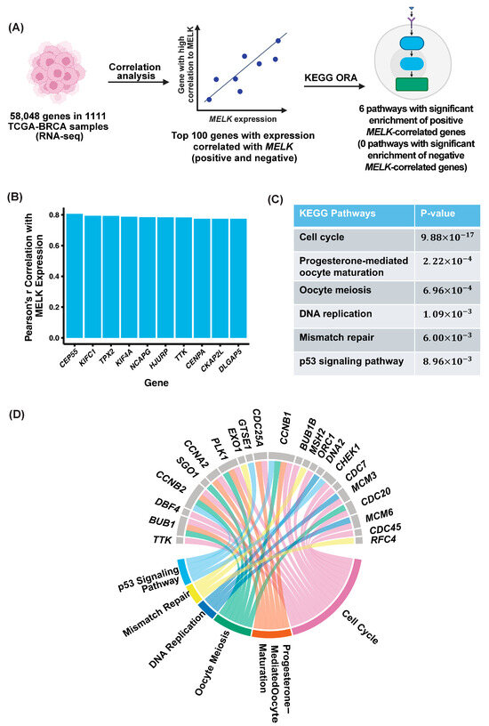 MELK and correlated gene expression are associated with tumorigenesis and metastasis pathways. (A) Schema of pathway analysis. Using gene expression from the TCGA-BRCA breast dataset, the top 100 genes positively and negatively correlated with MELK expression were used for overrepresentation analysis (ORA) in pathways from the Kyoto Encyclopedia of Genes and Genomes (KEGG). (B) A bar chart depicting the top ten genes with expression most positively correlated with MELK expression. (C) This resulted in six pathways from the positively correlated genes, shown in this table. p-values reported are adjusted. (D) A chord diagram of the pathways (colored borders) and the significantly correlated genes (grey borders) involved in each of the pathways. Genes are ordered by decreasing Pearson’s r in the clockwise direction and pathways by decreasing pathway significance in the clockwise direction. There were no significant pathways among the negatively correlated genes.