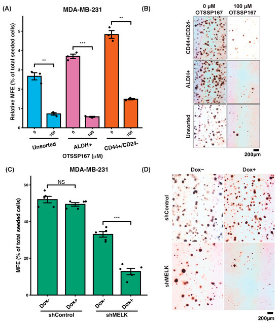 There is support for MELK’s role in the maintenance of stem and progenitor cells during development in mice [42] and zebrafish [45]. We used a mammosphere formation assay to assess the role of MELK in stem cell properties in breast cancer. We evaluated the role of MELK in breast cancer stem cell properties using a mammosphere formation assay in MDA-MB-231 cells, a high-MELK-expressing cell line. Treatment with the MELK inhibitor OTSSP167 significantly reduced mammosphere formation efficiency in cancer stem cell populations (CD44+/CD24− and ALDH+) compared to untreated controls. A less pronounced decrease in mammosphere formation was observed in the unsorted population, which largely contains non-stem cells, upon OTSSP167 treatment, further supporting MELK’s involvement in maintaining cancer stem cell properties (Figure 3A, representative images in Figure 3B) [46].