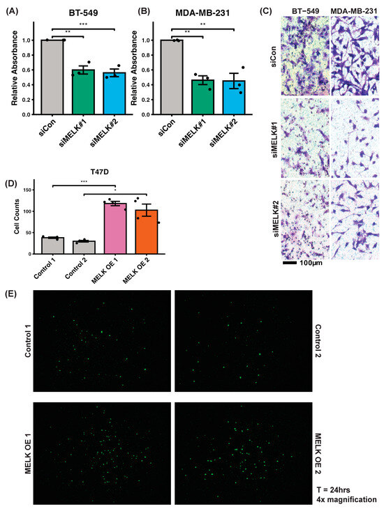 MELK knockdown reduces invasion efficiency in high-MELK-expressing cell lines BT-549 and MDA-MB-231, while MELK overexpression increases invasion efficiency in low-MELK-expressing T47D cells. (A) siRNA-mediated MELK knockdown significantly reduced invasion in BT-549 cells (n = 3; p = 0.0011 for siMELK#1, p = 0.0007 for siMELK#2). (B) Similar reductions in invasion were observed in MDA-MB-231 cells (n = 3; p = 0.0026 for siMELK#1, p = 0.0023 for siMELK#2). (C) Representative images of cells which successfully invaded the membrane for both cell lines. Images were taken at 40× magnification. (D) MELK overexpression in T47D cells (MELK OE 1 and MELK OE 2) significantly increased invasion efficiency compared to LacZ controls (Control 1 and Control 2; n = 4; p = 0.0002 and p = 0.0135 for Control 1/MELK OE 1 and Control 2/MELK OE 2, respectively). (E) Representative images of invaded cells for T47D control and MELK-overexpressing clones. Images were taken at 4× magnification. Data represent the mean of independent experiments with error bars indicating SEM. Statistical comparisons were performed using (A,B) one-way ANOVA with Dunnetts Multiple Comparison Test and (D) 2-sided Student’s t-test. * p < 0.05, ** p < 0.01, *** p < 0.001. OE: Overexpression.