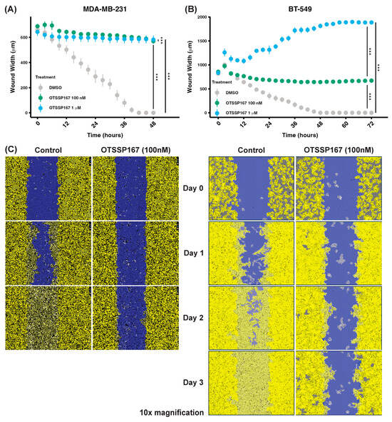 Cells (50,000/well) were seeded in ImageLock 96-well plates (Sartorius, Singapore) and incubated overnight at 5% CO2. Wounds were created using the WoundMaker Tool (Sartorius). For MDA-MB-231 cells, wells were washed twice with dPBS to remove detached cells, while washing was omitted for BT-549 cells to preserve wound clarity. Media containing 1 μL/mL DMSO (control), OTSSP167 at 100 nM, or OTSSP167 at 1 μM was added. Plates were scanned every 3 h in an Incucyte system (Sartorius) until control wells reached confluence (48 h for MDA-MB-231; 72 h for BT-549).