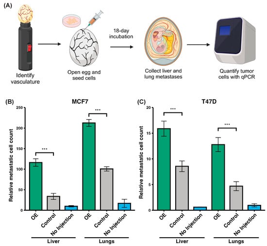 MELK overexpression in low-MELK-expression cell lines, MCF7 and T47D, increases metastasis in the chorioallantoic membrane (CAM) assay. (A) Schematic of the CAM assay and experimental design. (B) MELK overexpression (OE) in MCF7 cells resulted in a significant increase in metastatic cells in the liver (n = 10, p < 0.0001) and the lung (n = 10, p < 0.0001). (C) Similarly, MELK overexpression in T47D cells resulted in a significant increase in metastatic cells in the liver (n = 10, p < 0.0001) and the lung (n = 10, p < 0.0001). Data represent 10 independent experiments, and error bars represent SEM. A 2-sided Student’s t-test was used for comparison. *** p < 0.001.