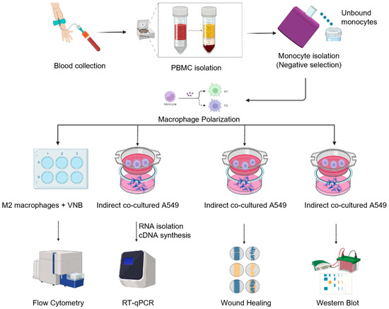 The use of anti-cancer agents that can directly block the expression of aggressive factors related to cancer malignancy and indirectly remodulate M2 macrophages can enhance the anti-cancer response. The aim of this study is to investigate the ability of vinorelbine to remodulate M2-like TAMs into M1 macrophages and the effects of vinorelbine on the progression and metastasis of NSCLC cells co-cultured with M2 macrophages. The schematic design of the experimental methods is shown in Figure 1.