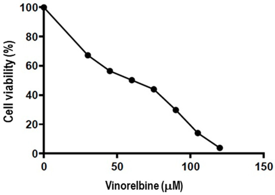 A549 cells were maintained in RPMI-1640 medium with L-glutamine supplemented with 10% fetal calf serum, 100 U/mL penicillin, and 100 µg/mL streptomycin at 37 °C in 5% CO2. A549 cells were cultured at a density of 1.5 × 104 cells/well in 96-well culture plates for 24 h. Following this, the cells were treated with different concentrations of vinorelbine (30, 45, 60, 75, 90, 105, and 120 μM) for 24 h. Then, cell viability was determined using XTT (Grisp, Porto, Portugal) [40].