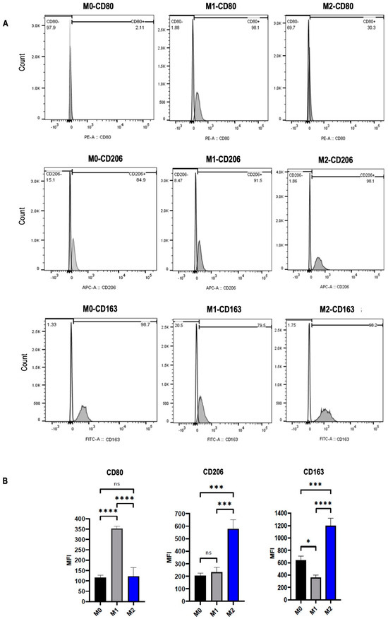 Polarization of human monocyte-derived macrophages (MDMs). Primary MDMs (M0) were unstimulated or were polarized into M1 (20 ng/mL LPS) and M2 (25 ng/mL IL-4 plus 25 ng/mL IL-10) for 48 h. Surface marker expression was analyzed by flow cytometry. (A) Histograms of percentages and (B) Boxplot graphs of MFI values for CD80, CD206, and CD163 after stimulating with LPS or IL-4/IL-10 for 48 h. The groups are compared with the control and with each other. Statistical analyses were performed using ANOVA, * p < 0.05; *** p < 0.001; **** p < 0.0001, ns; nonsignificant.