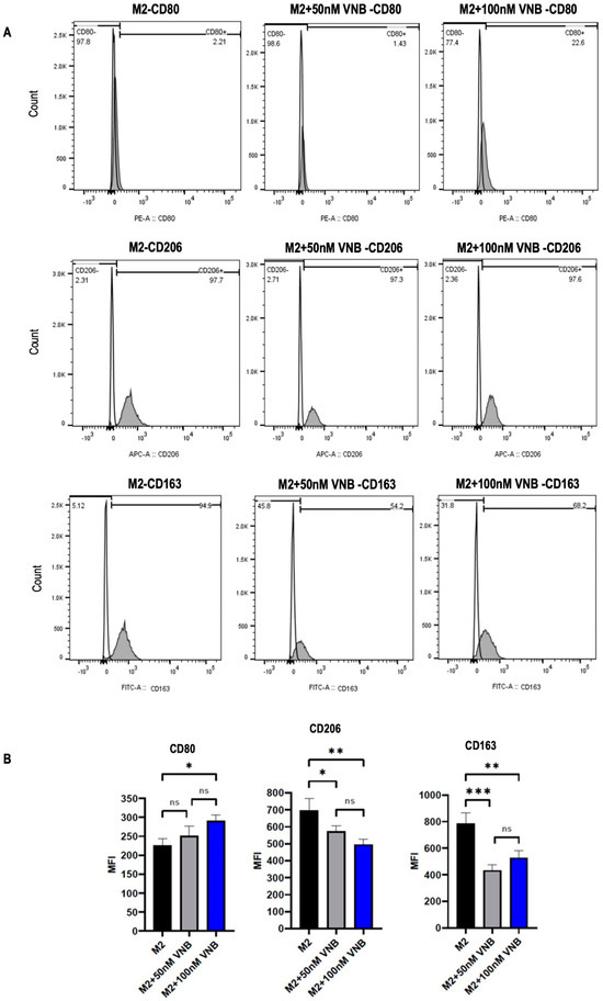 Vinorelbine reprogrammed M2 macrophages into the M1 subtype. Primary MDMs (M0) were polarized into M2 (25 ng/mL IL-4 plus 25 ng/mL IL-10) for 48 h. Surface marker expression was analyzed by flow cytometry. (A) Histograms of percentages and (B) Boxplot graphs of MFI values for CD80, CD206, and CD163 after treatment of M2 macrophages with/without vinorelbine (50 nM or 100 nM) for 48 h. The groups were compared with the control and with each other. VNB: Vinorelbine. Statistical analyses were performed with ANOVA, * p < 0.05; ** p < 0.01; *** p < 0.001; ns; nonsignificant.