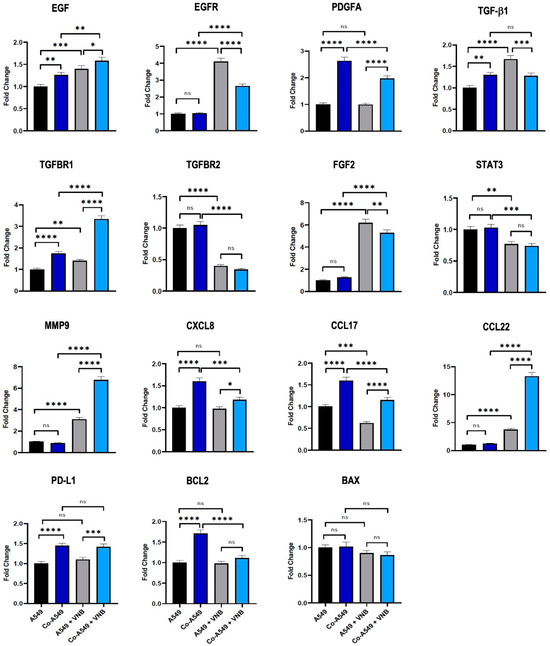 Vinorelbine increased mRNA expression levels of many genes that enhance cancer progression in NSCLC cells. A549 and A549 cells co-cultured with M2 macrophages were treated with vinorelbine (50 mM) for 24 h. Cells were harvested for RNA extraction, and mRNA expression levels of the genes were quantified by RT-qPCR. The groups were compared with the control and with each other. Statistical analyses were performed with ANOVA, * p < 0.05; ** p < 0.01; *** p < 0.001; **** p < 0.0001, ns; nonsignificant. VNB: Vinorelbine; Co-A549: co-cultured A549 cells. The colors of the boxes in the graph are shown as black; A549, dark blue; Co-A549, Grey; A549 + VNB, light-blue; Co-A549 + VNB.