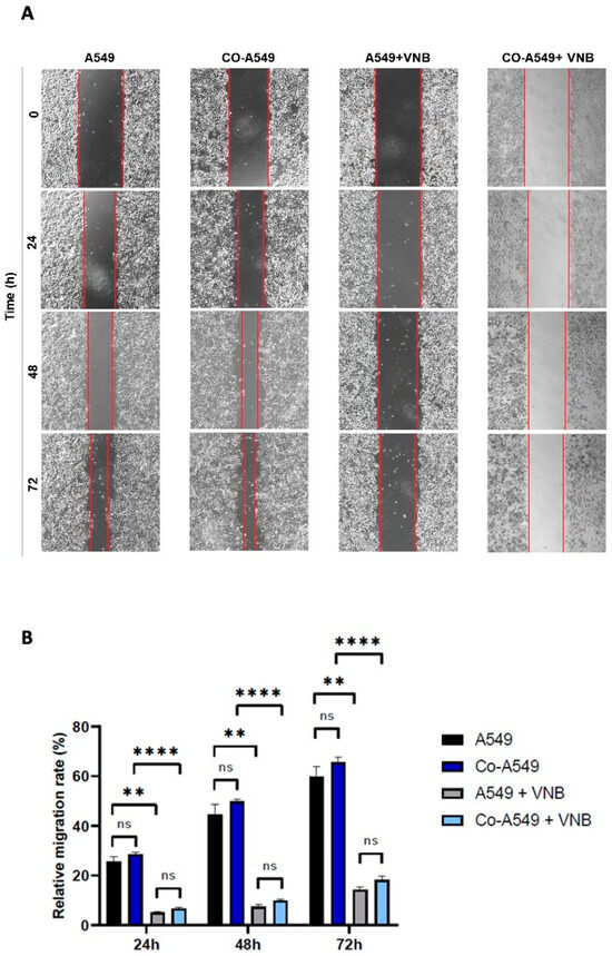 The efficacy of vinorelbine on non-small-cell lung cancer cell migration. (A) A549 or co-cultured A549 cells were scratched with a micropipette tip. After washing with PBS, vinorelbine-treated and untreated cells were incubated in medium. Images for different times (0 h, 24 h, 48 h, and 72 h) were taken. (B) Relative migration rate % of the cells, which is the percentage of healing of the scratch by the cells. The groups were compared with the control and with each other. Statistical analyses were performed with ANOVA, ** p < 0.01; **** p < 0.0001; ns = nonsignificant. VNB: Vinorelbine; Co-A549: co-cultured A549 cells.