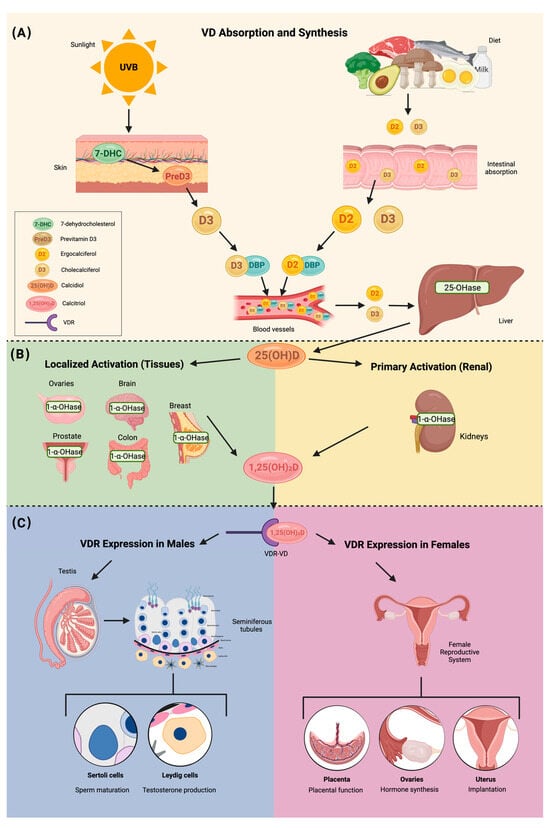 VD is a steroid hormone with two primary forms: vitamin D2 (D2) and vitamin D3 (D3). D3 is synthesized in the skin from 7-dehydrocholesterol (7-DHC) upon UVB exposure, while D2 is derived from ergosterol in plants and fungi, typically obtained through dietary sources [21,22]. Both forms of VD circulate in the bloodstream bound to the vitamin D-binding protein (DBP) and undergo sequential hydroxylation in the liver and kidneys.