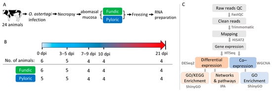 Boschiero, C.; Beshah, E.; Bakshi, M.; Miramontes, E.; Hebert, D.; Thompson, P.C.; Li, C.-J.; Zhu, X.; Zarlenga, D.; Liu, G.E.; et al. Transcriptional Profiling of Abomasal Mucosa from Young Calves Experimentally Infected with Ostertagia ostertagi. Int. J. Mol. Sci. 2025, 26, 2264. https://doi.org/10.3390/ijms26052264