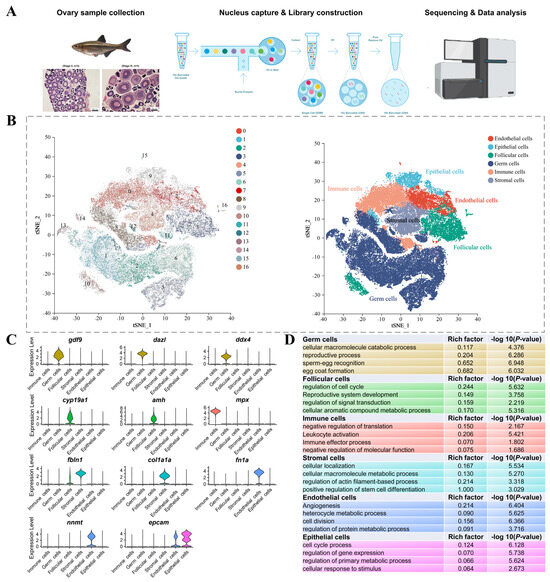 Identification of cell types in Sichuan bream ovaries using snRNA−Seq. (A) Flowchart of single−cell nuclear sequencing. The ovarian histological images are from our recent report [4]. (B) t−SNE analysis demonstrating the clustering (left panel) and identification (right panel) of ovarian cells. (C) Specific expression of marker genes in different cell types. (D) GO functional enrichment of DEGs among different cell types.