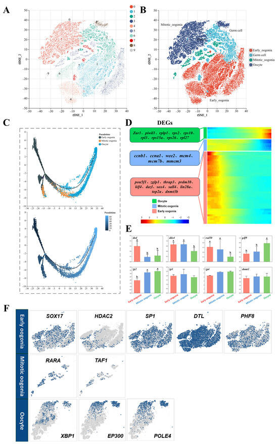 Dynamics of gene expression in germ cells during development. (A) Clustering of germ cell subtypes. (B) Identification of germ cell subtypes. (C) Developmental pseudotime trajectory of germ cell subtypes; different colors in the upper side represent different cell types, and the pseudotime trajectory in the lower side indicates the degree of cell differentiation, with darker colors indicating less differentiation. (D) Gene expression heatmap over pseudotime. (E) The expression levels of marker genes in three subtypes of germ cells; a,b mean values with unlike letters were significantly different (p ˂ 0.05). (F) Transcription factors of different germ cell subtypes.