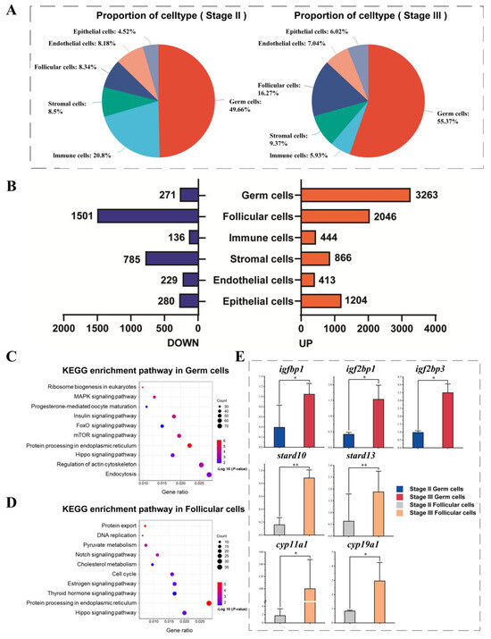 Effect of vitellogenesis on the gene expression profile of the follicle cell population. (A) Pie chart of proportional numbers of each cell type. (B) Numbers of up- and downregulated DEGs in the different cell types. (C) KEGG enrichment analysis of upregulated DEGs in germ cells during stage III. (D) KEGG enrichment analysis of upregulated DEGs in follicular cells during stage III. (E) The expression of DEGs at different developmental stages. * Mean values were significantly different (p ˂ 0.05); ** Mean values were highly significantly different (p ˂ 0.01).