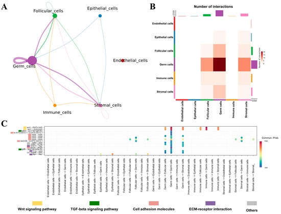 Cellular communication during vitellogenesis. (A) Intercellular communication network. (B) Intensity heatmap of intercellular interactions. (C) Pathways involved in ligand–receptor pairs.