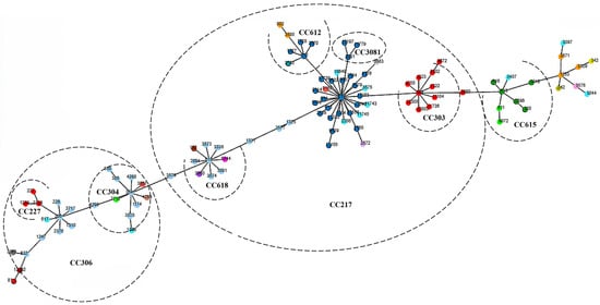 - Jolley, K.A.; Bray, J.E.; Maiden, M.C.J. Open-access bacterial population genomics: BIGSdb software, the PubMLST.org website and their applications. Wellcome Open Res. 2018, 3, 124. [Google Scholar] [CrossRef]