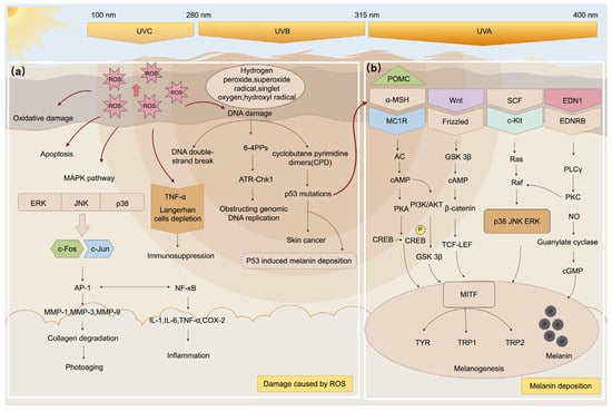 Molecular mechanisms of skin damage induced by ultraviolet radiation. (a) Oxidative stress and DNA damage triggered by UV. Ultraviolet (UV) radiation, encompassing UVA, UVB, and UVC, induces the production of reactive oxygen species (ROS), leading to oxidative stress, apoptosis, immunosuppression, and inflammation. ROS activate the MAPK pathway (ERK, JNK, and p38), which upregulates transcription factors c-Fos and c-Jun, promoting collagen degradation and contributing to photoaging. Additionally, UV induces DNA damage by forming cyclobutane pyrimidine dimers (CPDs) and 6-4 photoproducts, causing genomic instability, p53 mutations, and an increased risk of skin cancer. (b) Regulation of melanogenesis by UV-induced signaling pathways. UV radiation promotes melanin deposition through multiple signaling pathways, including α-MSH/MC1R, Wnt/β-catenin, SCF/c-Kit, EDN1/EDNRB, and NO signaling. These pathways converge on the transcription factor MITF, which orchestrates the regulation of melanogenesis.