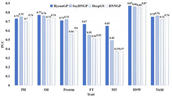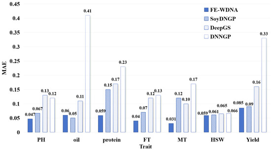We compared the performance of quantitative and qualitative trait prediction based on FE-WDNA with that of SoyDNGP, DeepGS, and DNNGP. Their performance for seven quantitative traits including plant height (PH), oil content, protein content, flowering time (FT), maturity time (MT), yield, and hundred-seed weight (HSW) was assessed using MAE, MSE and PCC as the indicators. Performance for four qualitative traits—flower color (FC), stem termination (ST), pod color (POD), and pubescence density (PDENS)—was evaluated using accuracy as the indicator.