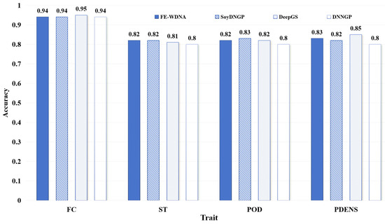 Comparison of qualitative trait prediction based on FE-WDNA and the existing methods based on SNP data. Soybean dataset. FC, flower color; ST, stem termination; POD, pod color; PDENS, pubescence density.