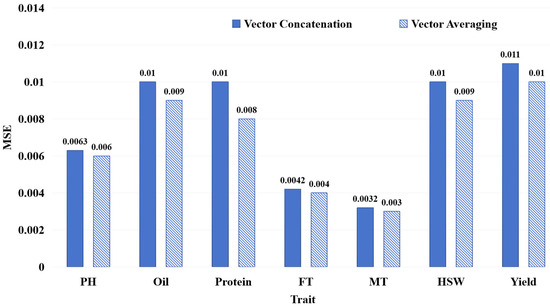 For all traits, the models using the vector averaging mode outperformed those using the vector concatenation mode. Based on these comparative results, we conducted exploratory analyses of the reason, considering the inter-chromosomal relationships and gene regulation. Previous research has indicated that Protein and Yield are complex, polygenic traits involving gene interactions across multiple chromosomes [20,21]. Traits such as FT and MT are closely related to the plant’s growth cycle, with gene loci distributed across different chromosomes, reflecting strong inter-chromosomal associations [22,23]. Oil synthesis and degradation involve multiple metabolic pathways and gene interactions [24,25]. Our analysis showed that the advantage of the vector averaging mode lies in its ability to reduce data dimensionality and lower model complexity while still capturing overall information, making it suitable for genome data with complex long-range dependencies and non-linear interactions in the genome.