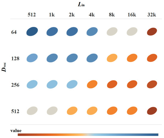 Regarding the MT of soybeans, the results indicate that the model’s performance improves consistently as both Lin, and Dvec increase. From the star-shaped heatmap distribution, it is clear that Lin has a significant impact on the model’s performance. As Lin increases incrementally from 512 to 32k, corresponding changes in performance are observed. For shorter Lin values (512 to 2k), the model demonstrates lower performance across different output dimensions, particularly in the 64- and 128-dimensional settings, where performance reaches the lowest (shaded in blue). This suggests that shorter Lin and lower Dvec values fail to capture sufficient genetic information, which limits the model’s predictive performance. As Lin extends to 4k and 8k, the model’s performance improves significantly, particularly in the 256- and 512-dimensional settings of Dvec, where performance metrics rise markedly (as indicated by the transition from blue to orange). At the longest Lin (16k and 32k), the model achieves optimal performance across all dimensions of Dvec (shown by the deeper orange color). This indicates that longer input sequences allow the model to better capture long-range dependencies in the genome, which in turn enhances the predictive accuracy.