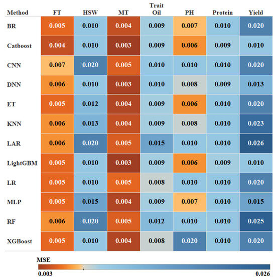 To evaluate the effectiveness of the proposed FE-WDNA model, we conducted parallel evaluations using nine conventional machine learning algorithms and three deep learning methods as trait prediction methods. These conventional machine learning models included Bayesian Ridge Regression (BR) [26], Catboost Classifier (Catboost) [27], Extra Trees (ET) [28], K-Nearest Neighbors (KNN) [29], Least Angle Regression (LAR) [30], Light Gradient Boosting Machine (LightGBM) [31], Logistic Regression (LR) [32], Random Forest Classifier (RF) [33], and Extreme Gradient Boosting (XGBoost) [34]. The deep learning methods included convolutional neural networks (CNN) [35], Multilayer Perceptron (MLP) [36], and deep neural networks (DNN) [37]. Each trait was trained using these models to facilitate a comparative analysis of their performance. The heatmap shown in Figure 8 displays the MSE of different methods based on FE-CDNA in predicting various soybean traits. The X-axis represents the phenotypic traits, and the Y-axis represents the trait prediction methods.