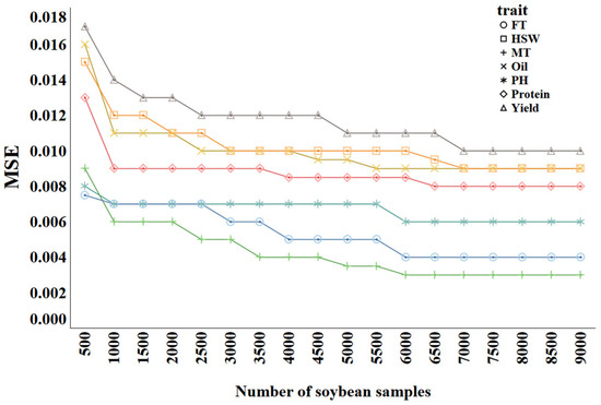 As the sample size increases from 500 to 9000, the MSE values for all traits generally show a downward trend. Common patterns can be observed in the curves across different traits. In the early stage (500 to 2000 samples), the MSE decreases rapidly, indicating that increasing the sample size significantly improves the model’s performance. In the later stage (after 5000 samples), the rate of the MSE decrease slows, suggesting diminishing returns as the sample size grows. For example, Yield starts with a relatively high MSE of approximately 0.017. As the sample size increases to 2000, the MSE rapidly drops to around 0.013, and then continues to decrease to about 0.011 at 9000 samples. This demonstrates that increasing the sample size benefits Yield predictions, though the improvement diminishes in the later stages. Similarly, Protein begins with an MSE of about 0.013, which drops rapidly to approximately 0.009 in the first 2000 samples, stabilizing around 0.0085 as more samples are added. Traits such as Oil, PH, MT, and HSW exhibit similar trends. For FT, the MSE starts at 0.0075 and decreases to about 0.007 by 1000 samples, almost remaining stable thereafter, indicating that FT is relatively easier to predict, with the model achieving good performance with fewer samples. Overall, for complex traits such as Yield, Protein, and Oil, increasing the sample size is especially important; meanwhile, for simpler traits such as FT, fewer samples are required to achieve good performance.