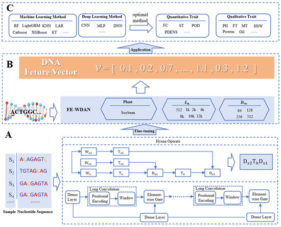 Figure 10 illustrates the framework of the FE-WDNA method, which is divided into three components: A, B, and C. Component A describes the process of constructing FE-WDNA based on HyenaDNA. As depicted in Figure 10A, the FE-CDNA model utilizes soybean DNA sequence data to fine-tune the improved HyenaDNA model. HyenaDNA is a decoder-only, sequence-to-sequence architecture defined by a stack of blocks built upon the Hyena operator. The pre-training objective of HyenaDNA is to predict the next nucleotide, which facilitates the elucidation of complex relationships between nucleotides. To achieve this, we adopt the natural DNA vocabulary and tokenize the DNA sequence, representing each nucleotide as a token. The tokens include “A”, “T”, “C”, and “G”, along with special tokens for padding, separation, and unknown characters. These tokens serve as the input for the fine-tuning process of HyenaDNA. The window length of the DNA input sequence (Lin) and the dimension of the output feature vector (Dvec) are key hyperparameters for training FE-WDNA. We experimented with Lin values of 512, 1k, 2k, 4k, 8k, 16k, and 32k, and Dvec values of 64, 128, 256, and 512.