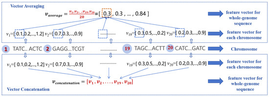 A plant sample of soybean includes 20 chromosomes, and FE-WDNA generates one feature vector for every chromosome. To construct a comprehensive feature vector for a plant sample, we propose two feature fusion methods, as illustrated in Figure 12. The first method is the equal-weighted averaging fusion (referred to as vector averaging), where 20 feature vectors are summed and averaged. The second method is the concatenation fusion (referred to as vector concatenation), in which the feature vectors from all chromosomes are concatenated to form a longer feature vector.
