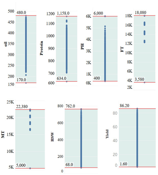 For the quantitative traits, the distribution of trait values is shown in Figure 14, where the maximum and minimum values are indicated by red horizontal lines.