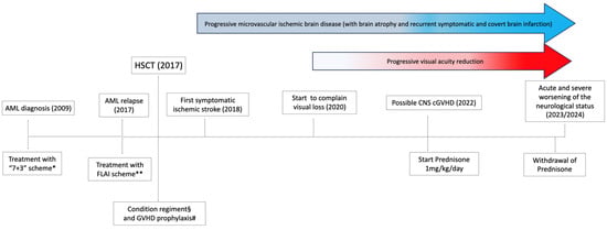 A 65-year-old man came to our attention for progressive visual loss and signs/symptoms of cortical–subcortical microvascular ischemic brain disease. His medical history was notable for acute myeloid leukemia (AML) (French–American–British classification M4: myelomonocytic subtype) with an inversion in chromosome 16 and deletion in chromosome 7. It had manifested with signs and symptoms related to anemia and thrombocytopenia ten years earlier, was treated early with chemotherapeutic agents, and then, after a relapse occurred in 2017, was without any clinical evidence of CNS involvement, with allo-HSCT with peripheral blood stem cells from an HLA-matched sibling followed by a GVHD prophylaxis regimen including cyclosporine for four months (Figure 1). The donor was a 71-year-old female who showed cytomegalovirus (CMV) seropositivity.