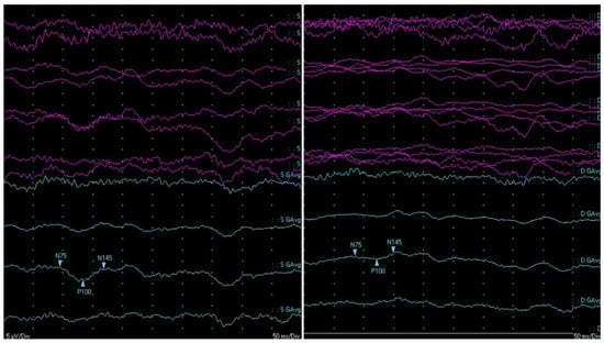 Visual conduction pathway assessment. The reversal pattern of VEP showed a predominant reduction in the amplitude of P100 in both eyes (worse on the right panel—right eye), which was not associated with a substantial modification of latency.