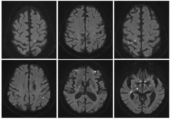 Cerebral acute microangiopathy. Axial MRI diffusion-weighted images (DWI) showing multiple bilateral small acute infarcts that occurred after steroid withdrawal.