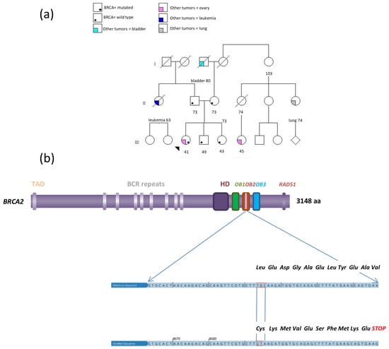 - Diez, O.; Gutiérrez-Enríquez, S.; Mediano, C.; Masas, M.; Saura, C.; Gadea, N.; Balmaña, J. A Novel de Novo BRCA2 Mutation of Paternal Origin Identified in a Spanish Woman with Early Onset Bilateral Breast Cancer. Breast Cancer Res. Treat. 2010, 121, 221–225. [Google Scholar] [CrossRef] [PubMed]