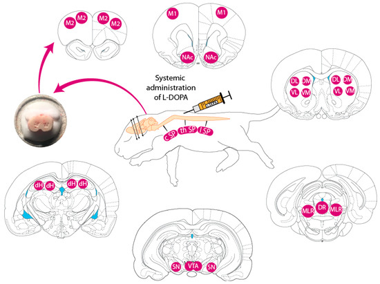 CNS regions sampled in PND5 newborn rats. cSP, cervical spinal cord; thSP, thoracic spinal cord; lSP, lumbar spinal cord; M1, M2, motor cortex; nA, nucleus accumbens (NAc); DM, dorsomedial striatum; DL, dorsolateral striatum; VL, ventrolateral striatum; VM, ventromedial striatum; dH, dorsal hippocampus; SN, substantia nigra; VTA, ventral tegmental area; MLR, mesencephalic locomotor region; DR, dorsal raphe. L-DOPA or its vehicle was administered peripherally via the subcutaneous route. The photomicrograph on the left shows the samples of tissue taken from the striatal quadrants bilaterally.