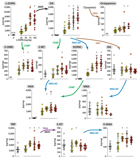 Dose–response effect of L-DOPA on different monoamine-related compounds with their enzymatic link in the cervical spinal cord. Neurochemical measurements are expressed as median/IQR and correspond to the tissue levels obtained 30 min after the injection of L-DOPA at different doses (25, 50, 75, and 100 mg/kg, identified by different colors) or its vehicle. The L-DOPA 25 mg/kg group serves as a reference for the multi-comparison tests (* p < 0.05, Dunn’s test). The enzymatic link between compounds has been reported as follows: AADC, aromatic amino acid decarboxylase; DBH, dopamine-β-hydroxylase; COMT, catechol-O-methyl transferase; MAO-AD, monoamine oxidase coupled to aldehyde dehydrogenase; TPH2, tryptophane hydroxylase; 3-OMD, 3-O-methyl L-DOPA; TRP, tryptophan; VMA, vanillylmandelic acid; 3-MT, 3-methoxytyramine. ND, not determined.