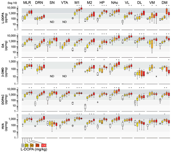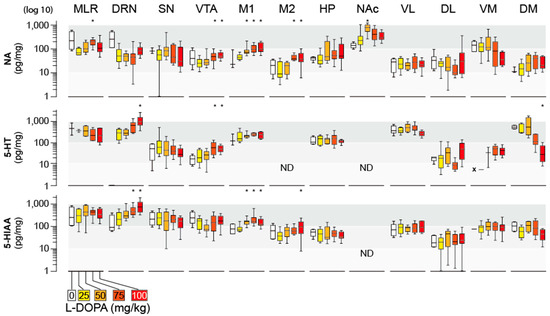 In most cases, we measured the tissue levels of dopamine (DA), noradrenaline (NA), and serotonin (5-HT)), L-DOPA, and some of their metabolites, including 3-O-methyl-DOPA (3-OMD), 3,4-dihydrophenylacetic acid (DOPAC), homovanillic acid (HVA), and 5-hydroxyindolacetic acid (5-HIAA) [28]. Unfortunately, while ensuring that one CNS region was studied using the same HPLC system, we could not always reproduce identical conditions over the whole study (see below).