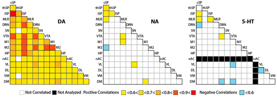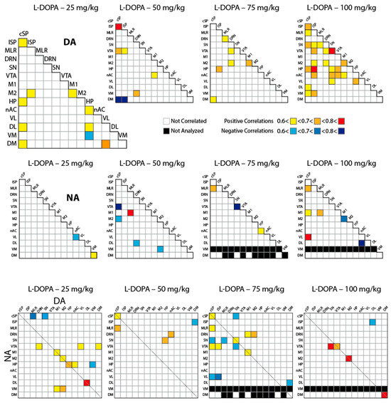 Correlative analysis of the tissue levels of DA, NA, and their combination across the sampled CNS regions. For each dose of L-DOPA (n = 12 to 14 pups), the tissue levels of DA (upper panels), NA (middle panels), or their combination DA/NA (lower panels) were studied using the Spearman rank order correlation test by pairs of brain regions. Only significant correlations (p < 0.05) are reported by the magnitude of the coefficient: positive correlations: <0.6 (yellow) < 0.7 (orange) < 0.8 (red); negative correlations: <0.6, blue. Gray boxes mean that the data were not numerous enough to perform correlative analysis.