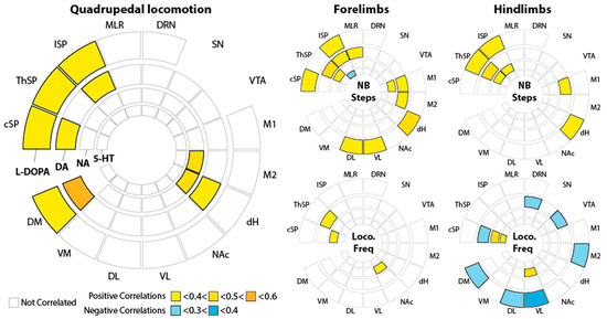As a final step, we addressed whether correlations between CNS monoamines and the locomotor activity monitored 30 min after L-DOPA injections could be revealed (Figure 7). Of note, none of the animals that did not walk (all animals receiving the vehicle and mostly all animals receiving 25 mg/kg L-DOPA) were included in this analysis. The locomotor parameters were extracted from the sequences of air-stepping expressed during the 3 min period preceding collection of the brain and spinal cord. These included the % of quadrupedal locomotion, the number of forelimb and hindlimb steps, as well as the forelimb and hindlimb stepping frequencies reported in our previous publication [13].