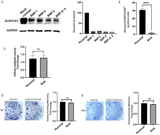 ALDH1A1 knockout bulk cells does not impact cellular metabolism, colony formation, or radiation response. (A) Western blot validation and quantification of ALDH1A1 knockout (KO) in targeted CRISPR/Cas9 ribonucleoprotein (RNP) targeted bulk cell populations. Data is represented as percent control of ALDH1A1 protein expression normalized to GAPDH. (B) Percent of positive cells as determined by the ALDEFLUORTM assay in ALDH1A1 KO bulk cells and the parental cell line. (C) Alamar blue assay measured cellular metabolism in ALDH1A1 KO bulk cell line. Fold change was expressed as a ratio of day 5/day 1. Bulk KO of ALDH1A1 showed no change in colony formation without (D) or with 8 Gy radiation (E), as compared to the parental cell line. Data is plotted as the mean ± standard error of the mean normalized to respective control cells. *** p < 0.001, ns = not significant.