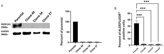 The bulk population of targeted cells contains a mixture of cells with varying levels of ALDH1A1 knockout. To ensure a complete loss of ALDH1A1 expression, we isolated single-cell clones from the ALDH1A1 KO bulk population. Three clonal lines (clone 40, clone 34, and clone 27) were confirmed to be complete knockouts via Western blotting (Figure 2A) and Sanger sequencing (Figure S2A). Analysis of ALDEFLUORTM activity in all three clonal lines revealed significant decreases in ALDEFLUORTM positivity compared to the parental line (Figure 2B and Figure S2B). These results indicate a critical role for ALDH1A1 in ALDEFLUORTM activity in the three knockout lines.
