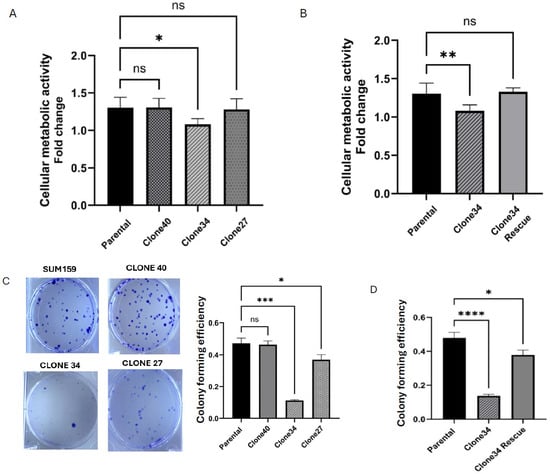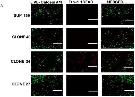 To investigate the effect of ALDH1A1 KO on cell viability in clonal lines, we performed Calcein-AM/ETHD-1 staining to detect live and dead cells. While no significant changes in viability were observed in Clones 27 and 40, Clone 34 exhibited a significantly lower number of live cells, and a higher number of dead cells compared to the parental SUM159 line (Figure 4A,B). This reduction in viability in Clone 34 was rescued by the overexpression of ALDH1A1 (Figure 4C and Figure S4A).