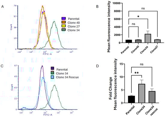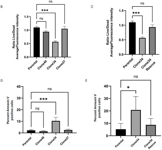 Furthermore, Annexin-V/PI staining revealed an increased percentage of Annexin V positive cells in Clone 34 compared to the parental line, which was similarly rescued by ALDH1A1 overexpression (Figure 4D,E and Figure S5). Given ALDH1A1’s role in ROS metabolism, we also measured ROS levels in the clonal lines. As shown in Figure 5A,B, ROS levels were significantly elevated in Clone 34 compared to the parental line, and this effect was reversed by rescuing ALDH1A1 expression (Figure 5C,D). These findings suggest that Clone 34 depends on ALDH1A1 for maintaining redox balance and cell viability, unlike other clonal lines.