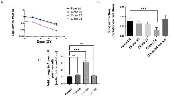Loss of ALDH1A1 significantly affects colony forming efficiency and increases radiation sensitivity in ALDH1A1 knockout clonally derived cell lines. (A) Clonogenic curve shows a decreased surviving fraction in clone 34 only compared to the parental line. (B) Surviving fraction at 8 Gy radiation in ALDH1A1 knockout (KO) clones and the parental calculated as radiation over no irradiation for each individual line. Clone 34 shows a significantly decreased survival fraction. Rescue of ALDH1A1 in clone 34 improves survival fraction to that of the parental line. (C) Significant increase in apoptosis in clone 34 only after radiation exposure plotted as Annexin V positive cells treated with 8 Gy over that of non-irradiated cells and plotted as fold change over parental. Data is plotted as mean ± Standard error of the mean. *** p < 0.001, ns = not significant.