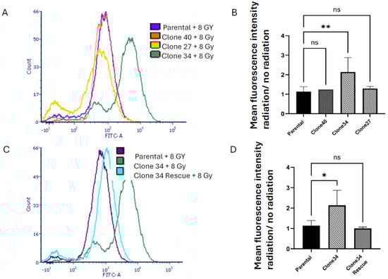 Radiation is known to increase ROS levels [], so we examined ROS accumulation in ALDH1A1 knockout clones after 8 Gy radiation. As shown in Figure 7A,B, ROS levels significantly increased in Clone 34 upon radiation, even when normalized to pre-treatment levels. This effect was reversed by restoring ALDH1A1 expression (Figure 7C,D). No significant changes in radiation-induced ROS levels or sensitivity were observed in other clonal lines (Figure S7A,B).