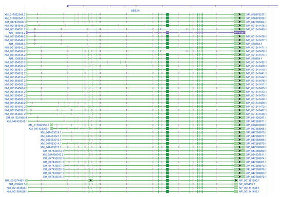 Around 50 transcript candidates of ubiquitin-protein ligase E3A [Homo sapiens (human)] were proposed and graphed from NCBI within the chromosome 15q11.2, assembly GRCh38.p14 at location NC_000015.10. https://www.ncbi.nlm.nih.gov/gene?Db=gene&Cmd=DetailsSearch&Term=7337, accessed on 31 August 2024.
