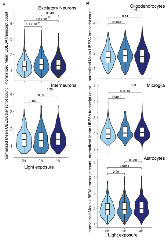 The visual stimulation induced Ube3a expression in the visual cortical area. The raw cell-by-gene matrix was downloaded from GSE102827. Both cell-type annotation and visual stimulus timing were used as indicated by the original authors. The x-axis represents the visual stimulus time, and the y-axis indicates the normalized UBE3A expression level. T-tests were performed to compare the different stimulus groups. (A) UBE3A expression in the excitatory neurons and interneurons. (B) UBE3A expression in glia: oligodendrocytes, microglia, and astrocytes.